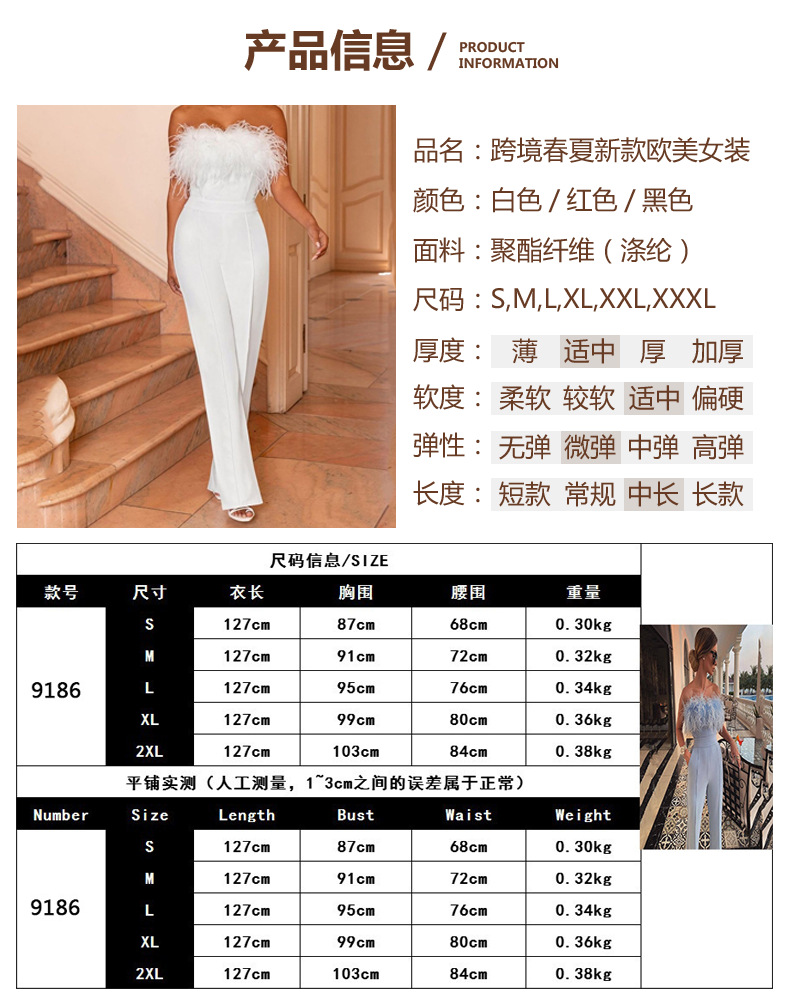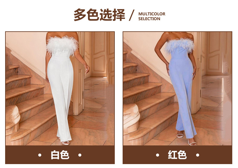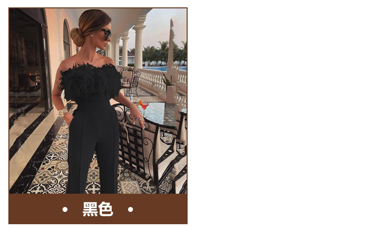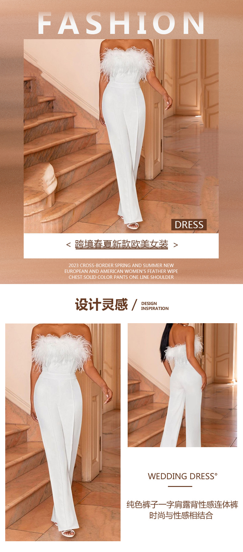 2023春夏新款欧美女装羽毛抹胸纯色裤子一字肩露背性感连体裤