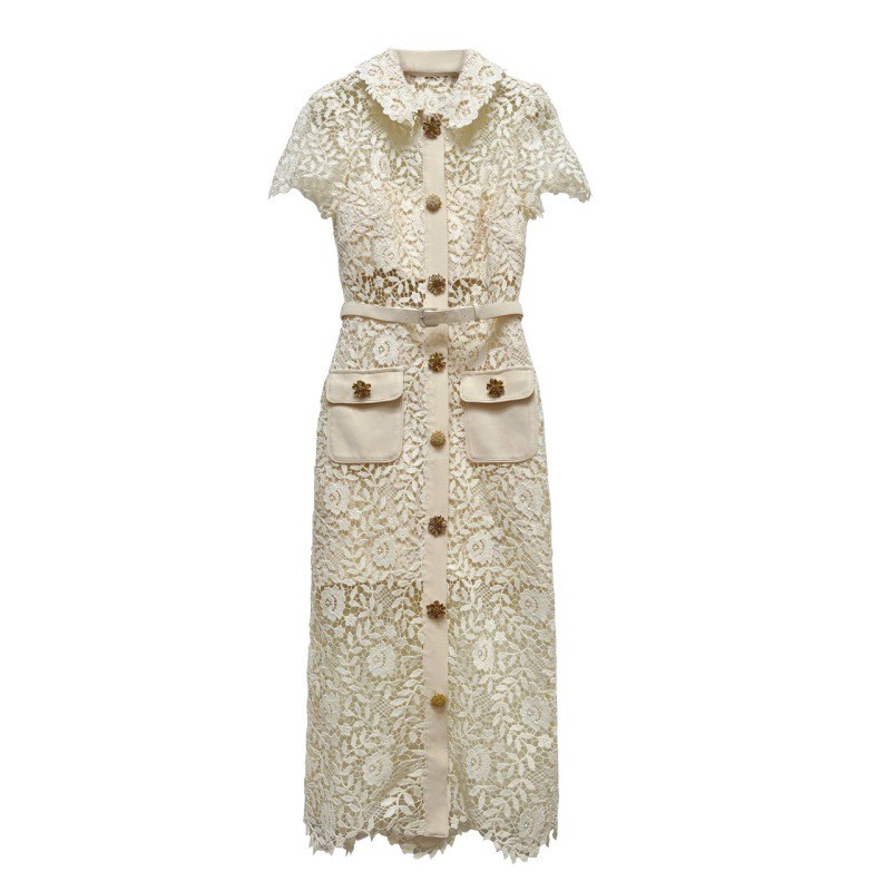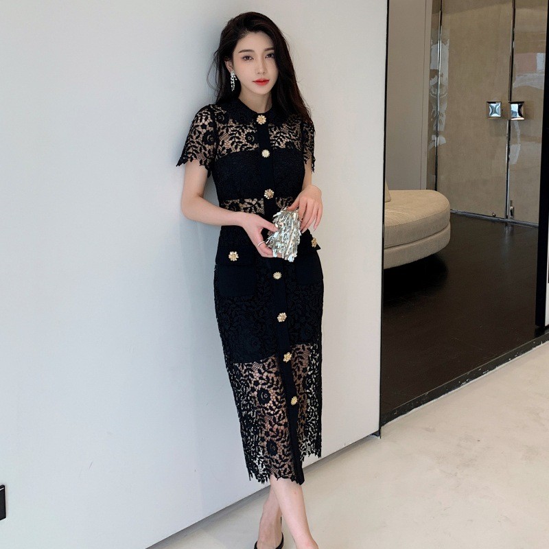 2023春夏新款女装性感小心机蕾丝中长裙翻领短袖连衣裙子米色黑色