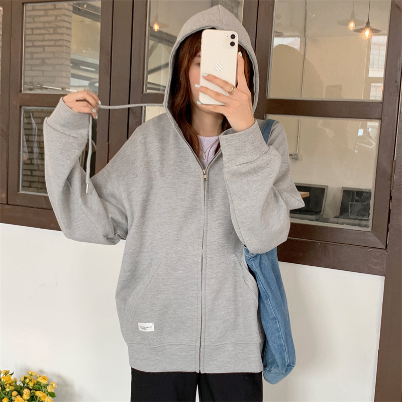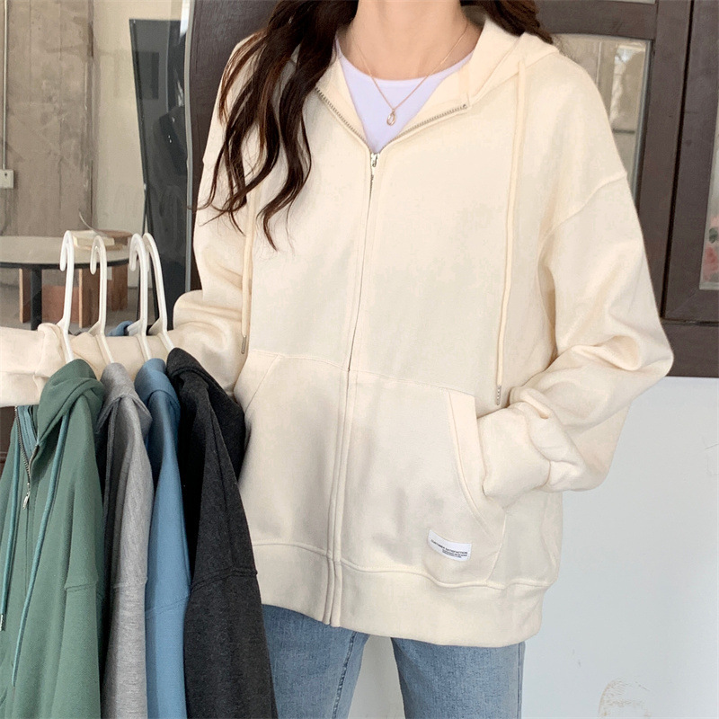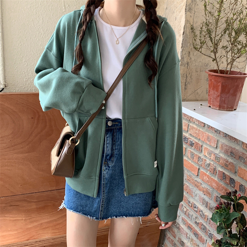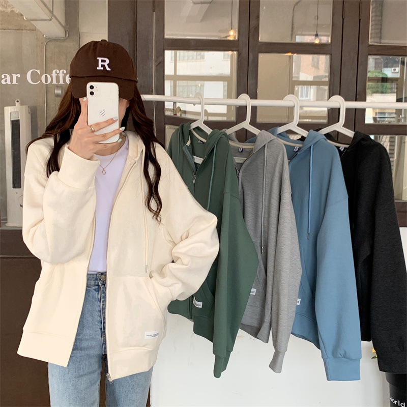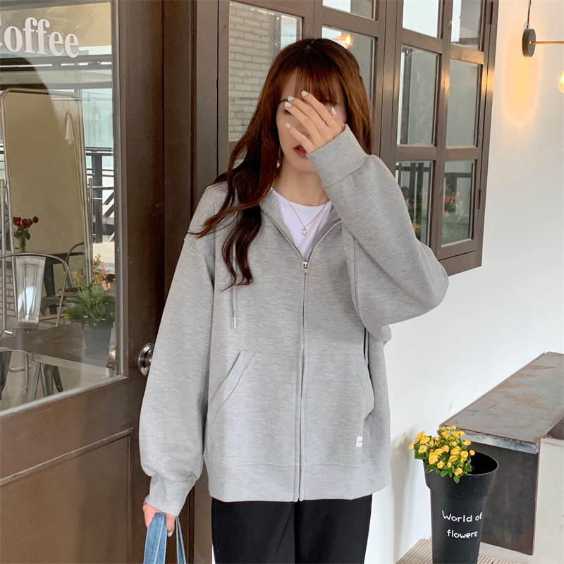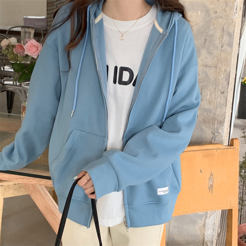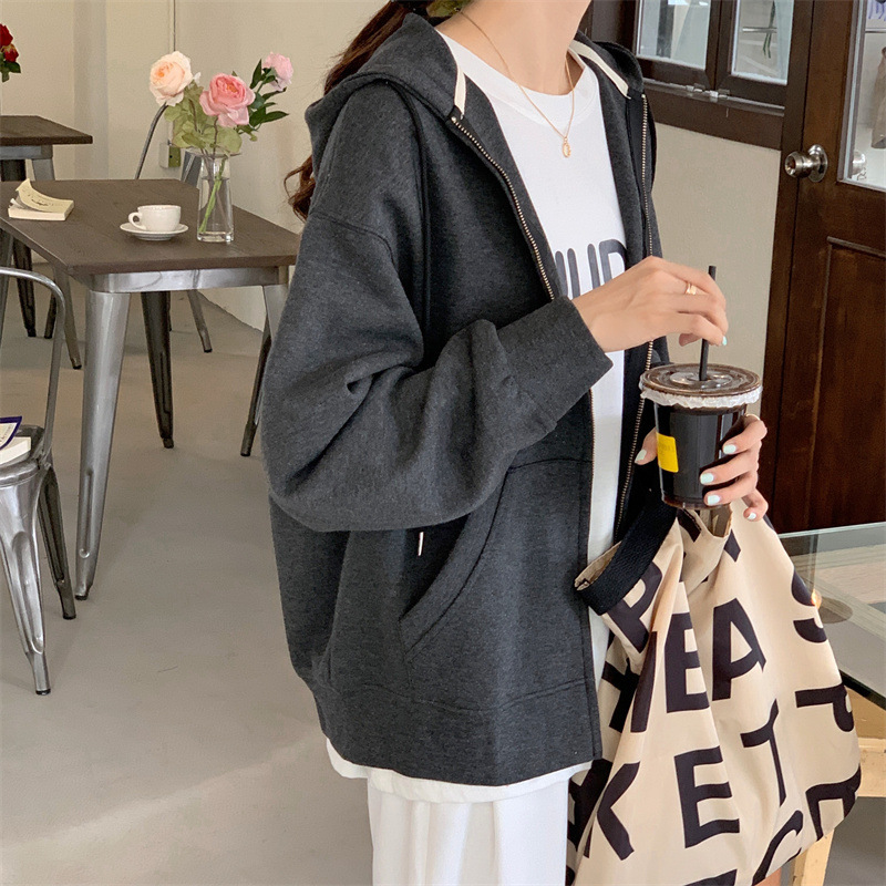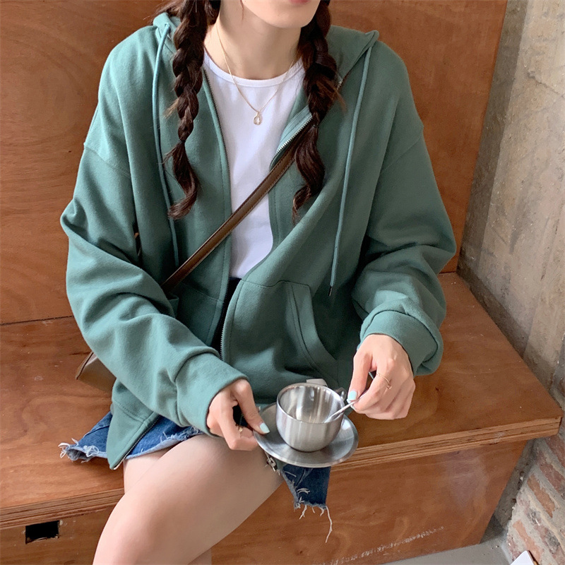 韩版宽松BF风长袖开衫连帽卫衣休闲外套女2023春秋学院风纯色上衣