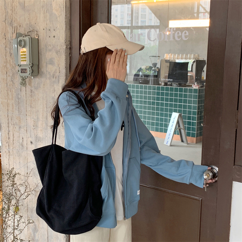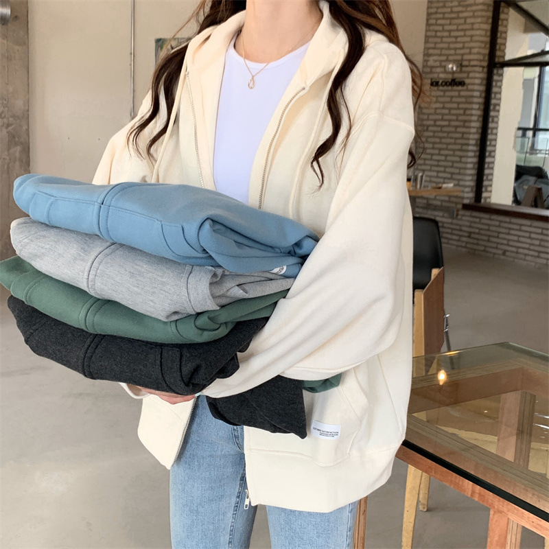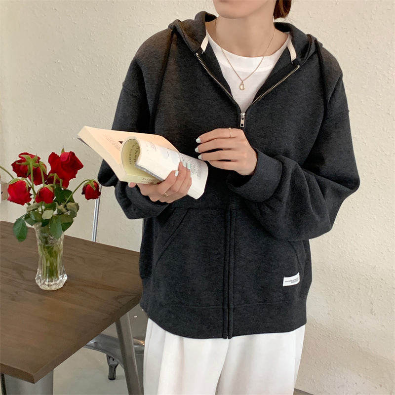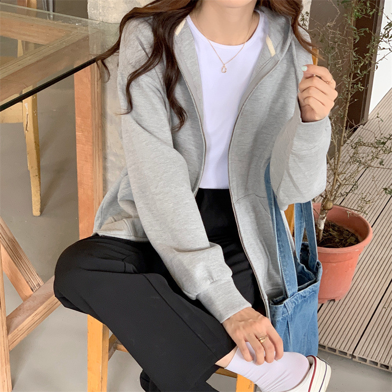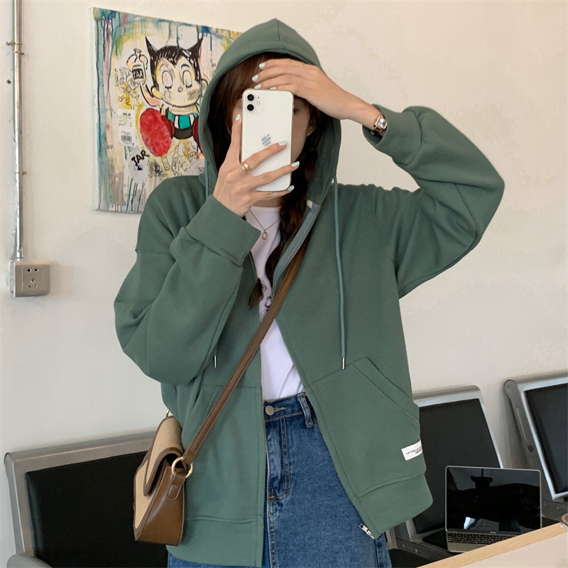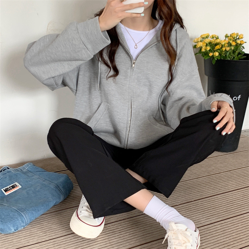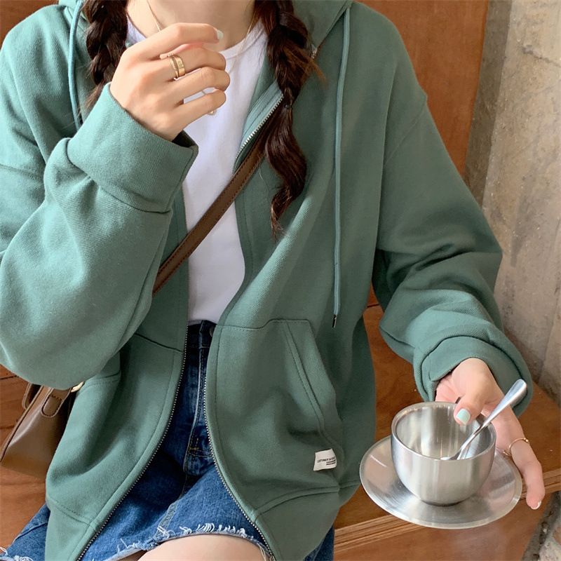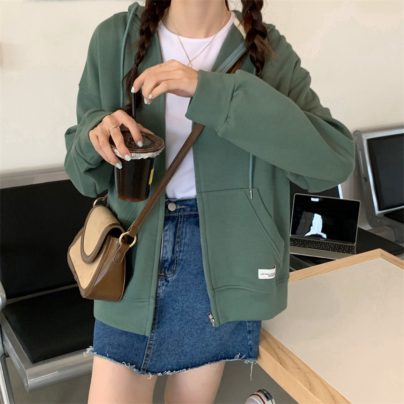 韩版宽松BF风长袖开衫连帽卫衣休闲外套女2023春秋学院风纯色上衣