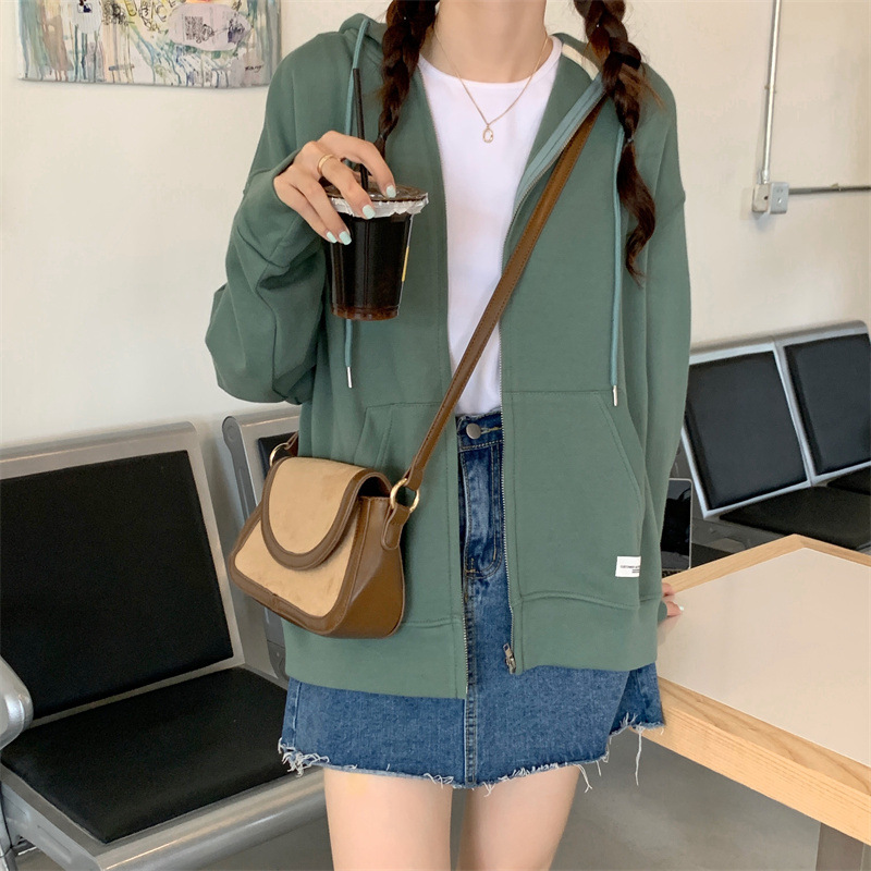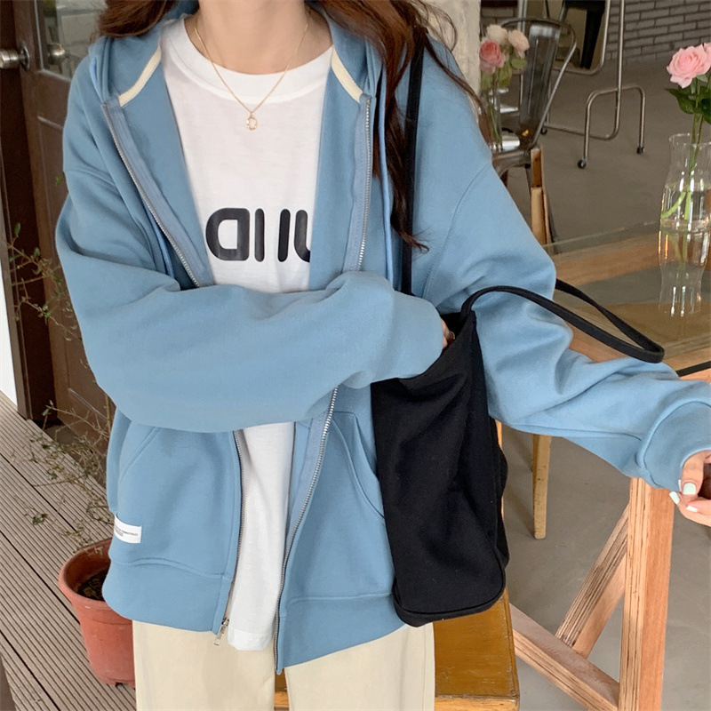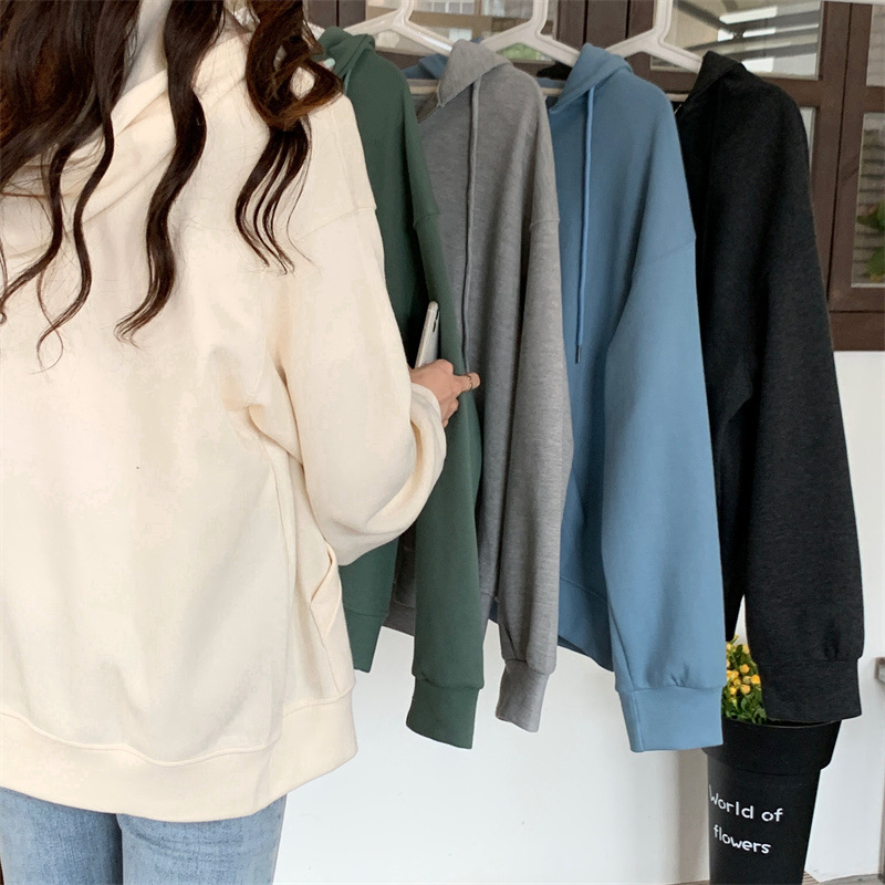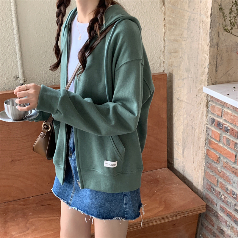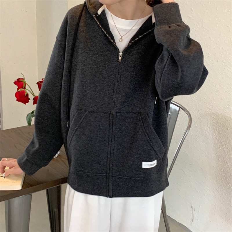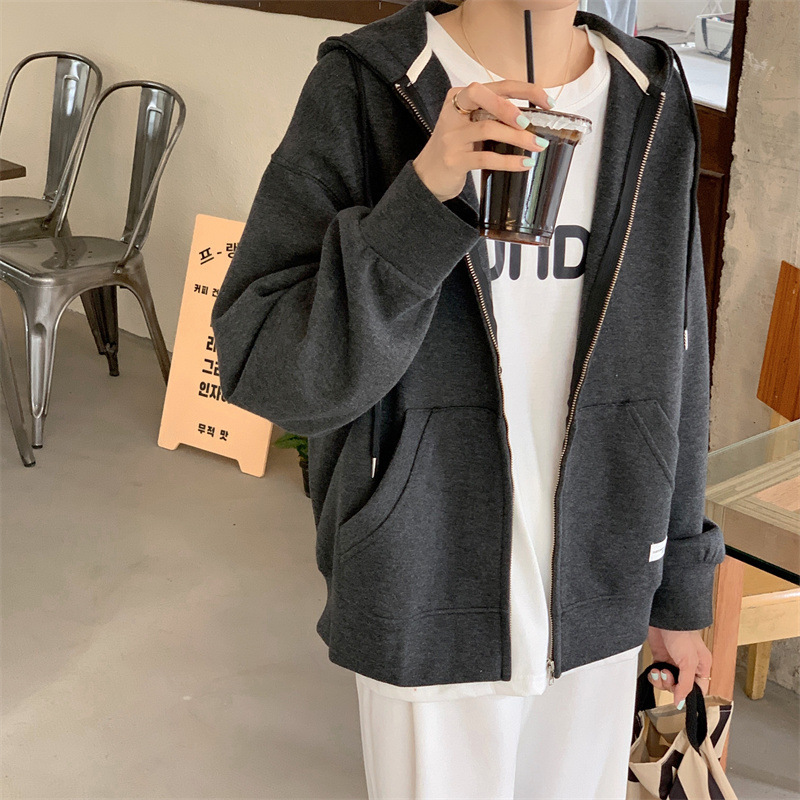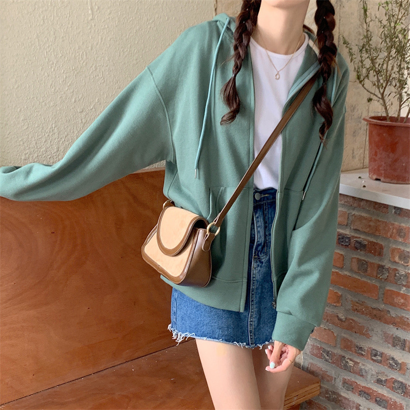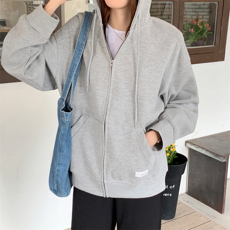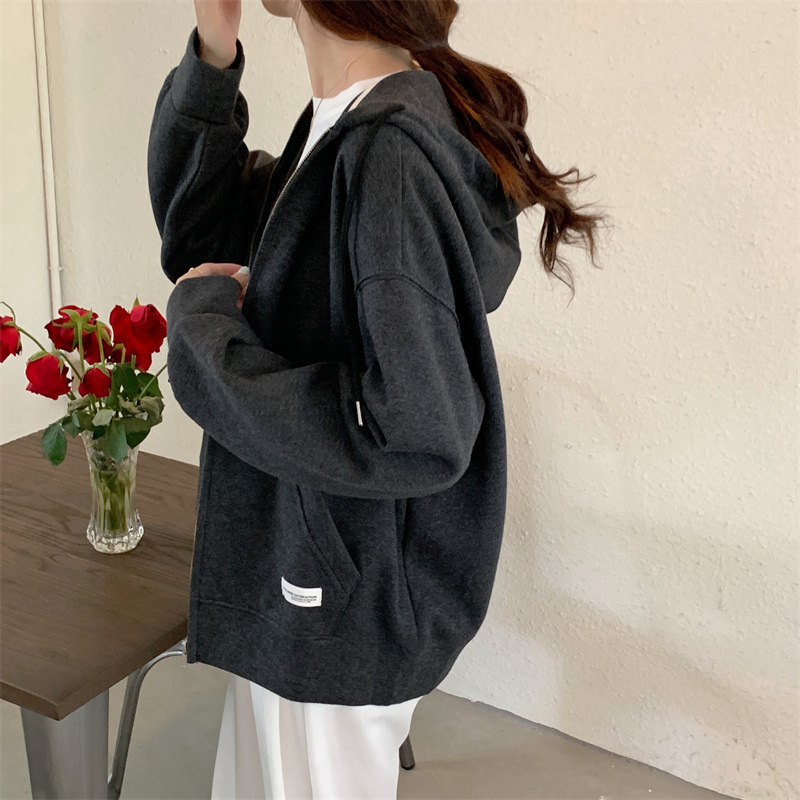 韩版宽松BF风长袖开衫连帽卫衣休闲外套女2023春秋学院风纯色上衣